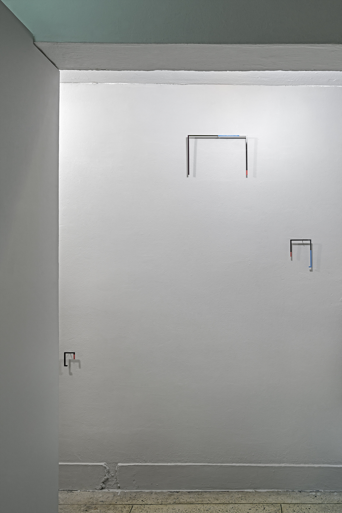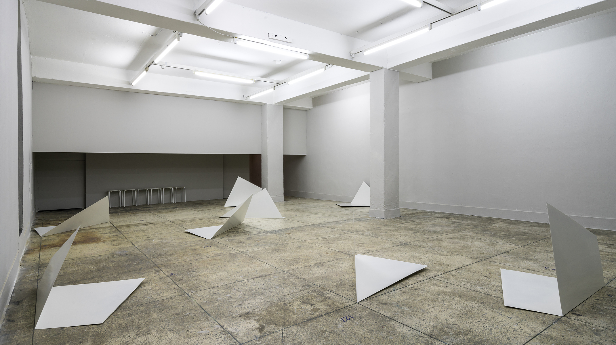 Grids divide planes and make standard of the position. As a line doesn’t exist in our reality, the plane doesn’t exist either. Planes exist just as a layer in a space that we see. The terrazzo on the floor in Sarubia (Gallery) makes an invisible layer of aplane. Each tile is not of equal length, so the grid is uneven. This work is a line drawing on this plane. The line, which cannot be drawn, happens between the two planes of folded aluminium board. This line is the same length as the tile it is placed upon. The work is given three dimensions by it’s volume as a sculpture. In the two different dimensions coinciding at the same time, lines occur. Everything doesn’t really exist. They are just little accidents in a recognition world. The audience can sit and watch the exhibition, or they can go in to the theatre and experience the space.